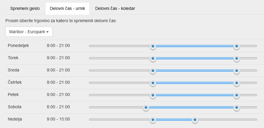 Za vsako trgovino se lahko nastavi urnik delovanja števca, ki ga prilagodimo delovnemu času. S tem se izognemo štetju obiska izven odpiralnega časa (prihodi/odhodi zaposlenih, dostave, …).